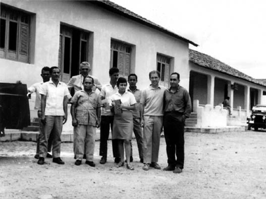 et les techniciens devant l'école d'agriculture abandonnée où ils s'étaient installés pour la mission.